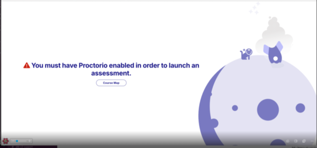 The student will see an alert stating "You must have Proctorio enabled in order to launch an assessment." |