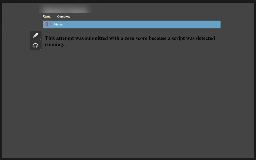 The student will see an alert stating "This attempt was submitted with a zero score because a script was detected running." |